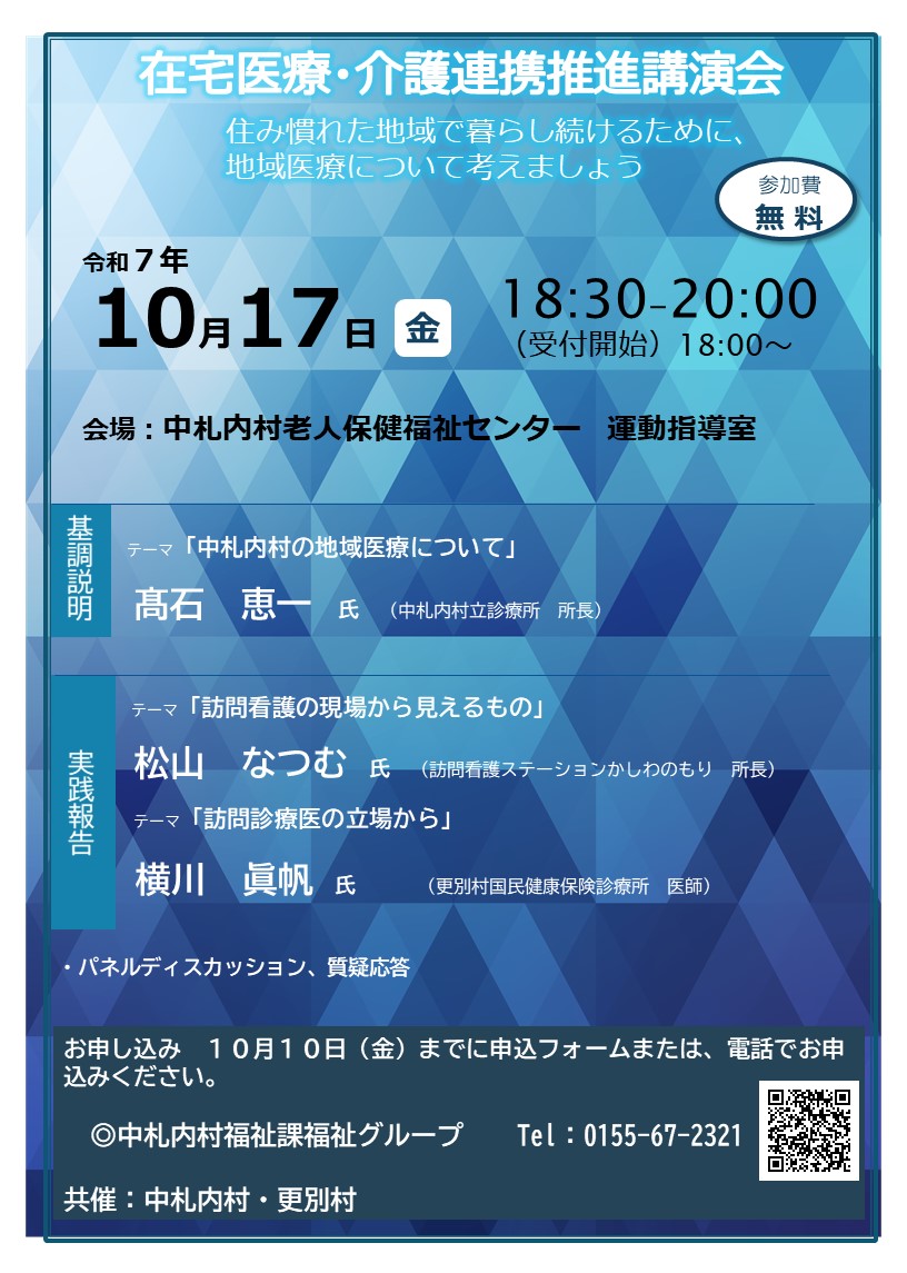 住み慣れた地域で暮らし続けるために、中札内村・更別村共催により、地域医療の在り方を考える講演会を開催します。ぜひご参加ください。
