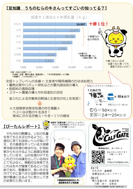 北海道河西郡中札内村の公共牧場である『中札内村大規模草地育成牧場(なかさつないむらおおきぼそうちいくせいぼくじょう)』や酪農業について、一般住民の方々に広く知っていただくため、広報活動の一環として『むらの牧場通信』を作成いたしました。