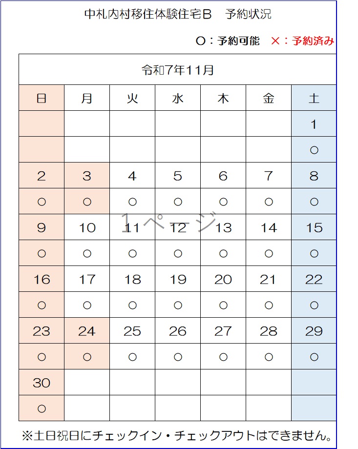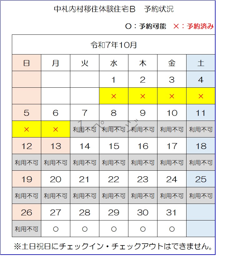 【E-mail】n-ijyu@vill.nakasatsunai.hokkaido.jp移住体験住宅予約状況(令和7年9月22日時点)