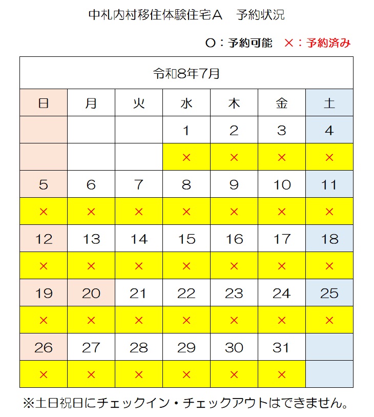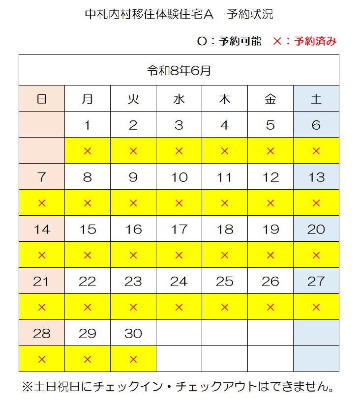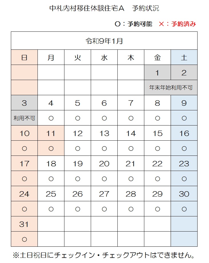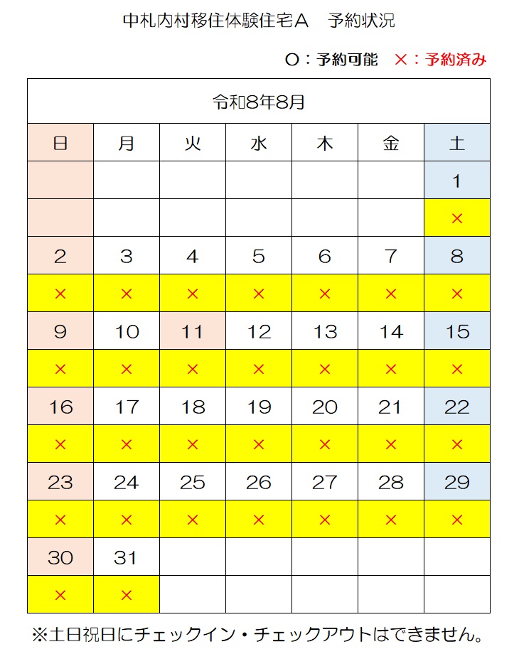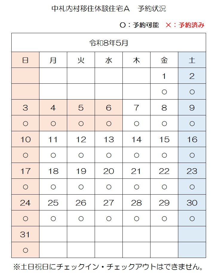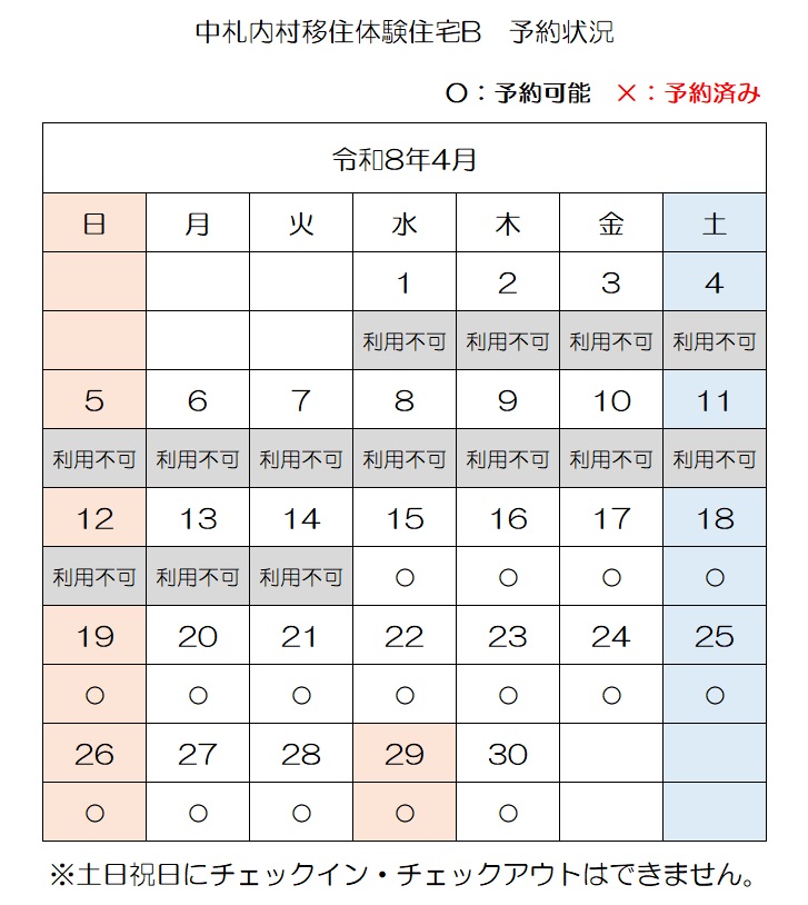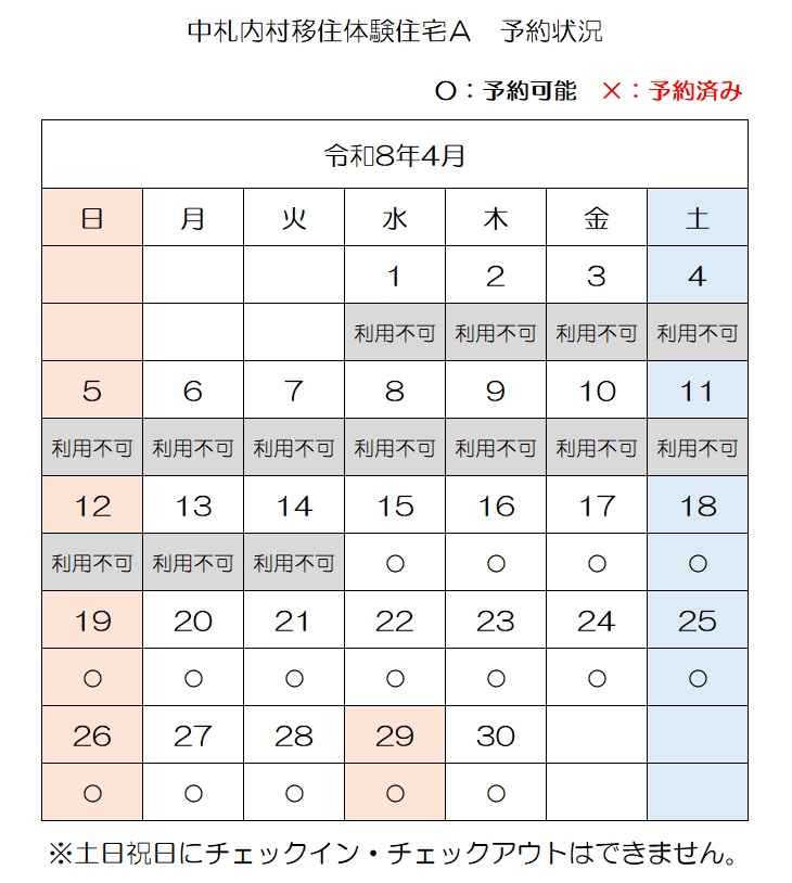 【E-mail】n-ijyu@vill.nakasatsunai.hokkaido.jp移住体験住宅予約状況(令和8年4月3日時点)