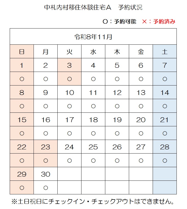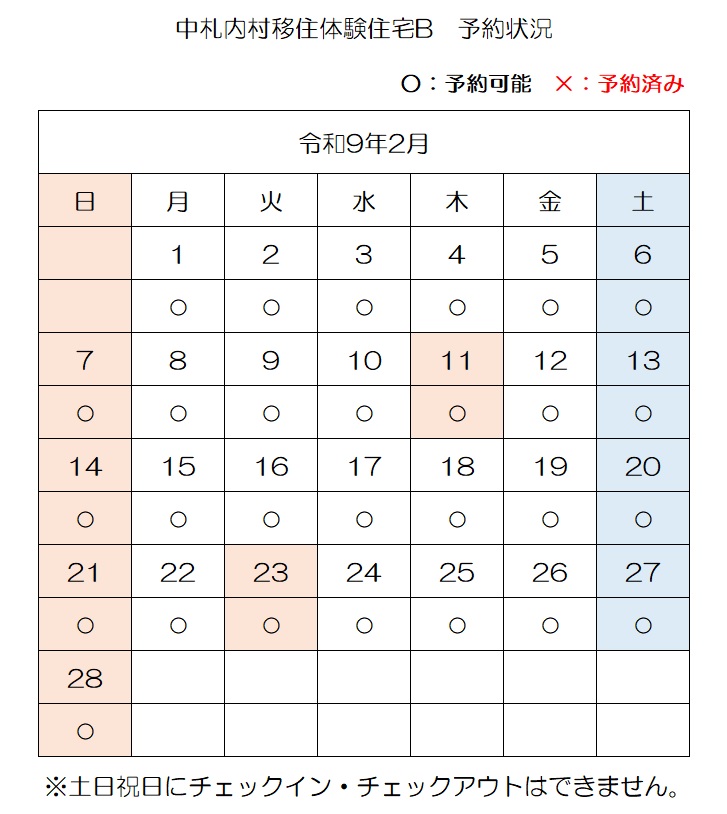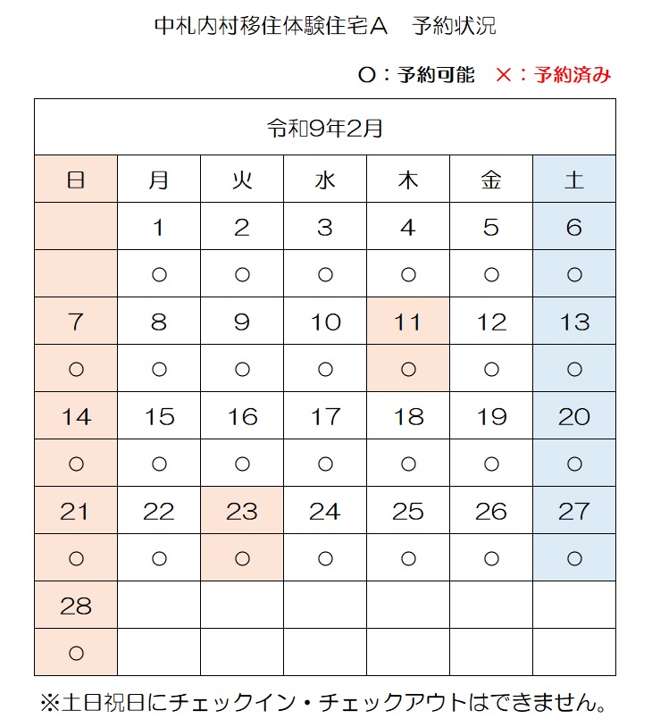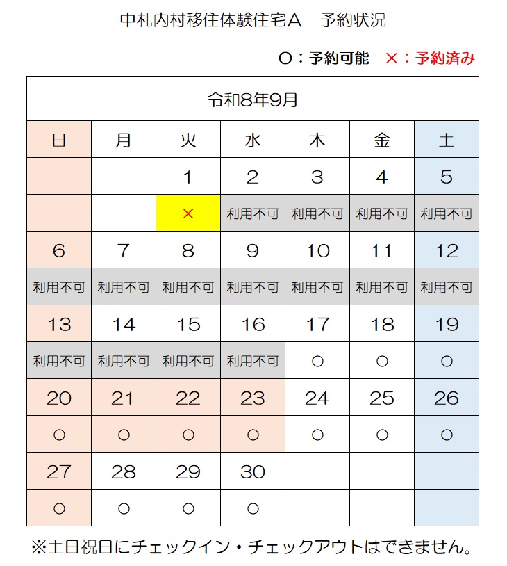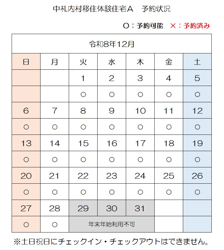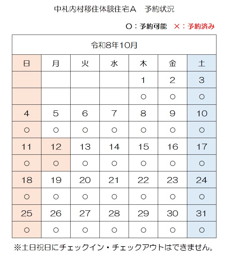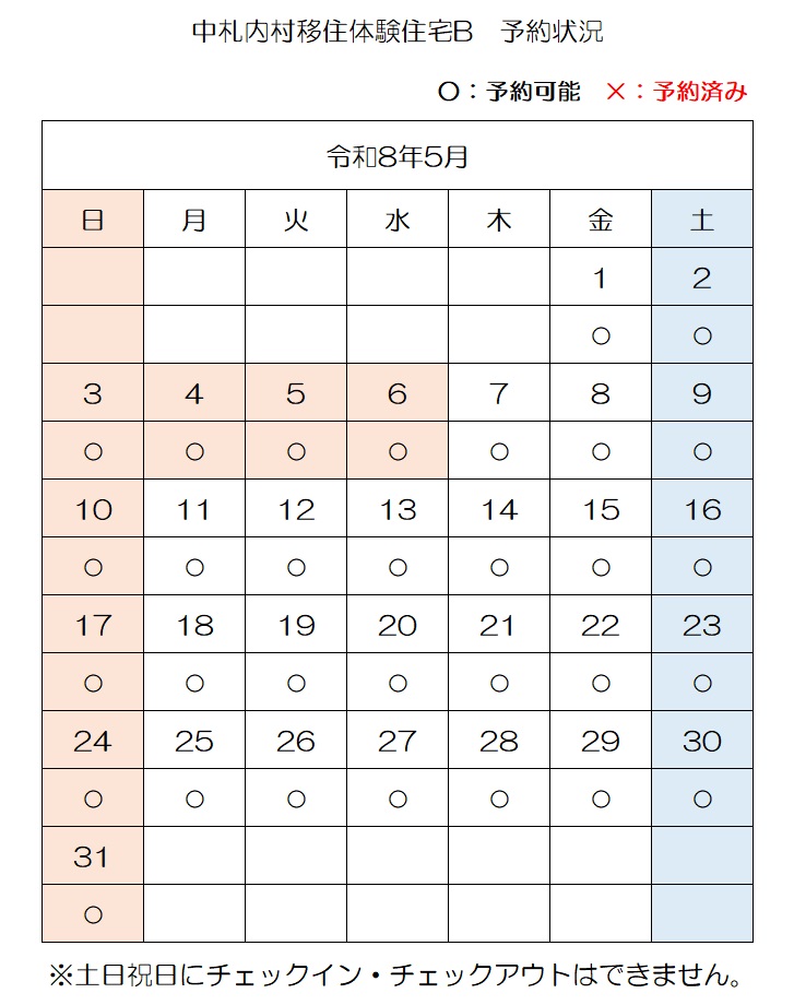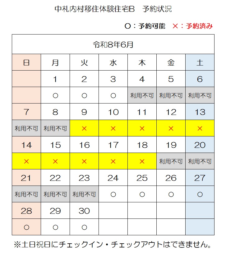 【E-mail】n-ijyu@vill.nakasatsunai.hokkaido.jp移住体験住宅予約状況(令和8年4月3日時点)
