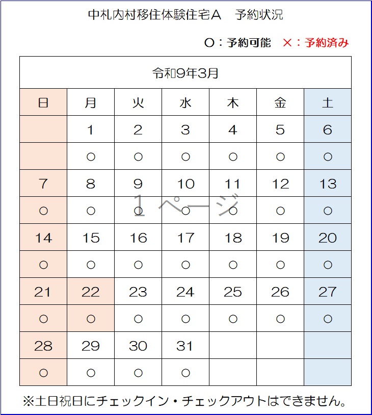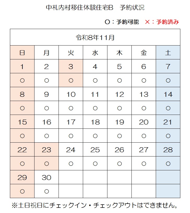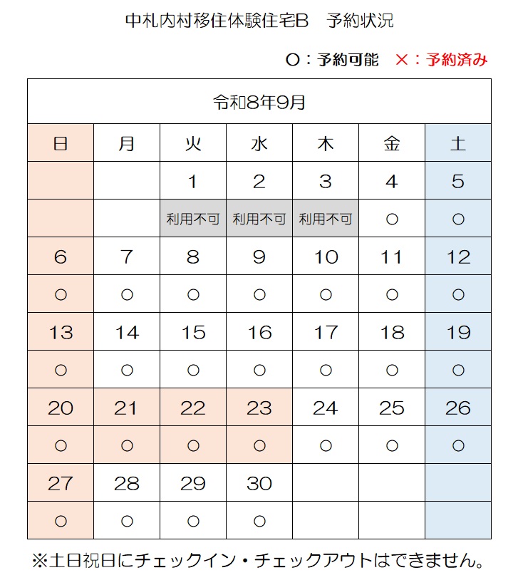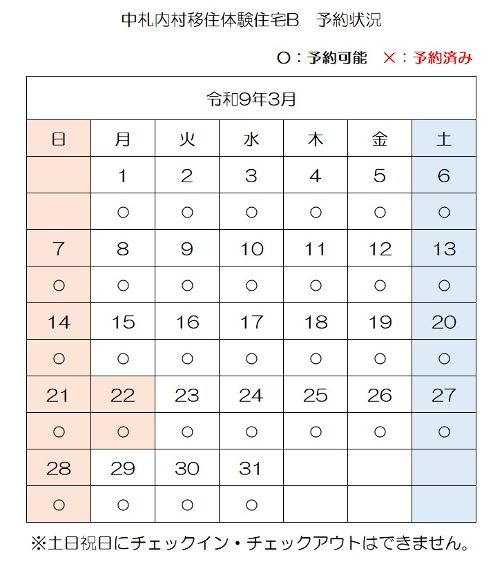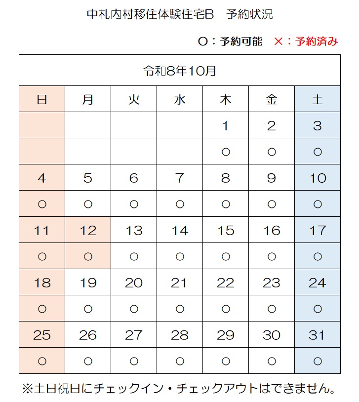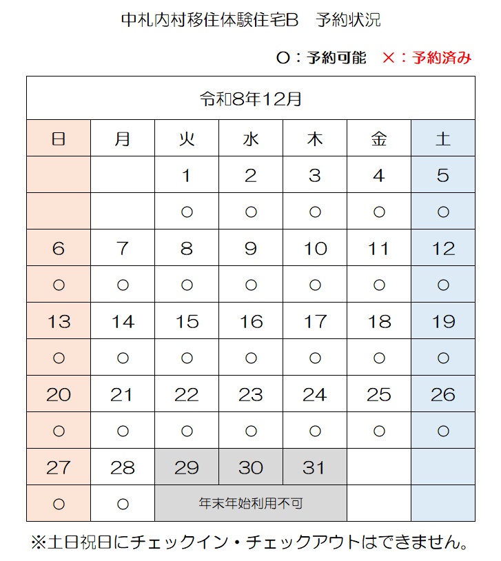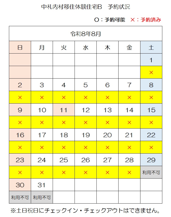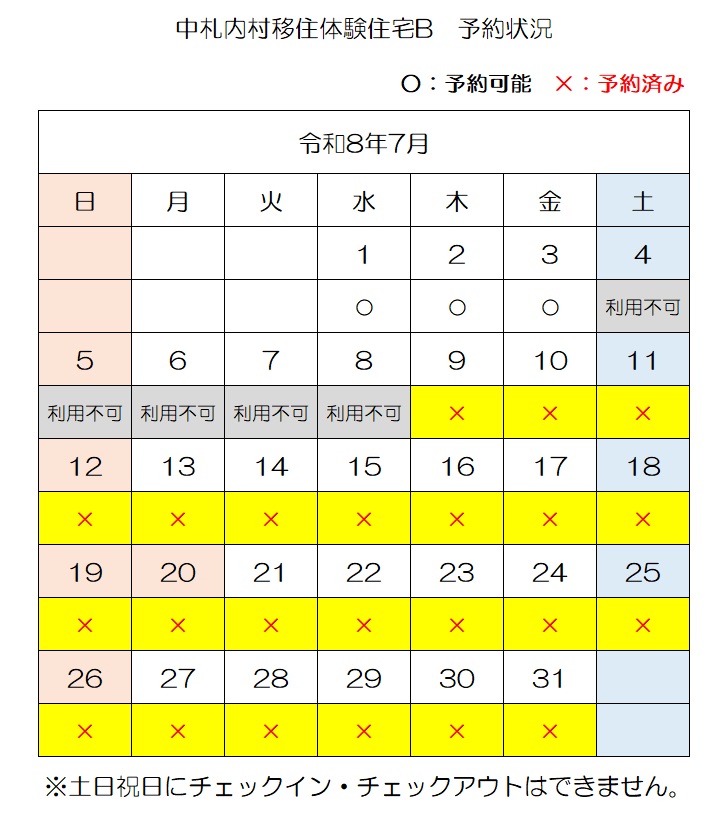 【E-mail】n-ijyu@vill.nakasatsunai.hokkaido.jp移住体験住宅予約状況(令和8年4月3日時点)