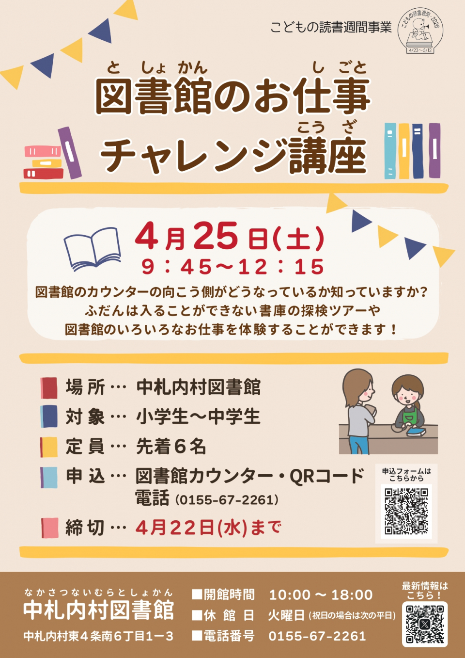 | 申 込 | 4月22日までに 図書館カウンター、電話(0155-67-2261)、 ポスター右下の申込専用QRコードでお申し込みください |