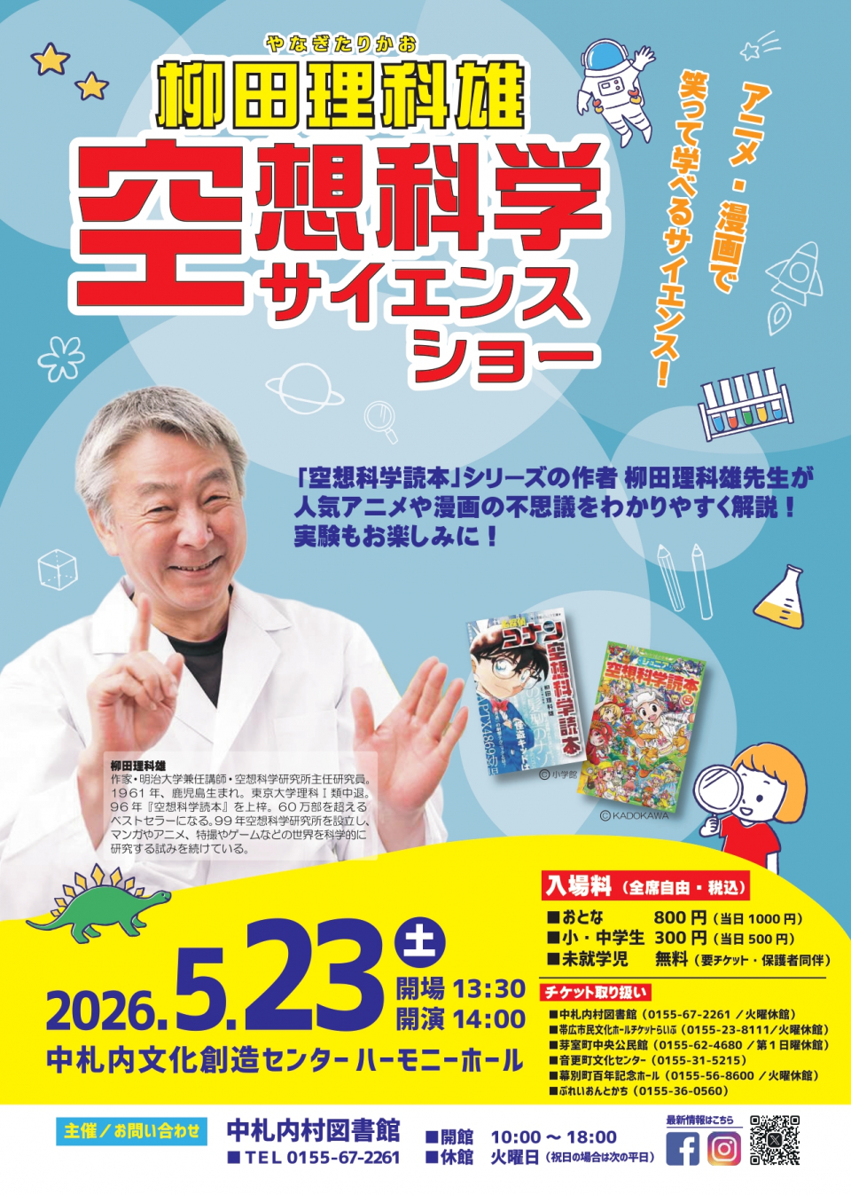 空想科学読本の作者 柳田理科雄先生が、人気アニメや漫画に出てくる不思議なシーンについて、科学的に解説してくれます!来場者参加型の実験もお楽しみに!
